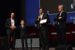 De gauche à droite : Alexandre Greschner, vice-président de Wacker Neuson ; Jean-Noël Onfield, François Escourrou, président de Wacker Neuson France ; Bertrand Carret. © CDF Lauréat : Wacker Neuson pour le dumper DV60 Dual View.Personnalité de l’année
